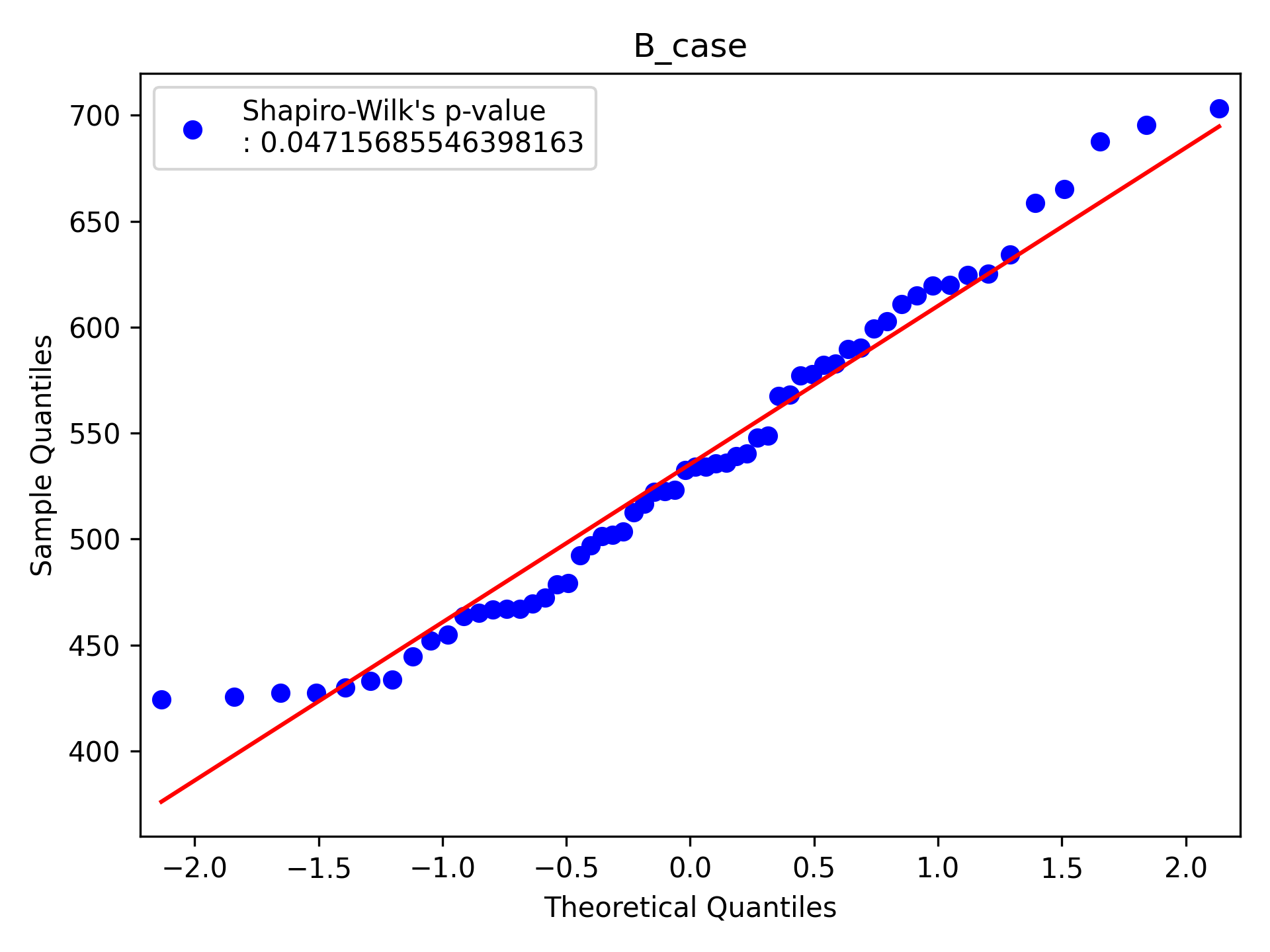 하지만 QQ plot에서 보면 normal 분포에 많이 벗어나지 않은 것으로 보인다. Normality test를 통해 얻은 p-value로 판단을 하기에는 고려해야할 요소들이 몇 가지 있다. 아래 링크 참고.