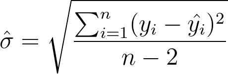 Standard error of estimate는 예측 모델의 값(보통 regression line)과 관측된 값이 평균적으로 얼마나 차이나는지를 나타내는 값이다. 보통 sigma로 표기하며 각 x값에 해당하는 관측값 yi와 regression line에서의 값 yhi의 차이를 제곱하여 더하고 자유도로 나눈 값의 square root로 정의된다.