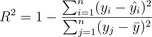 R-square는 gooness-of-fit의 measure로 사용된다. R-square는 관측된 값 yi와 관측된 값들의 평균값 yb과의 차이(total variance)에 비해, 예측된 모델(regression line)의 값과 관측값에 차이(variance explained by model)가 얼마나 나는지 말해주는 지표이다. 다시말해, R-square는 regression model이 관측값을 잘 설명하느냐이며, total variance와 비교하여 정량적으로 보여주는 수치이다.