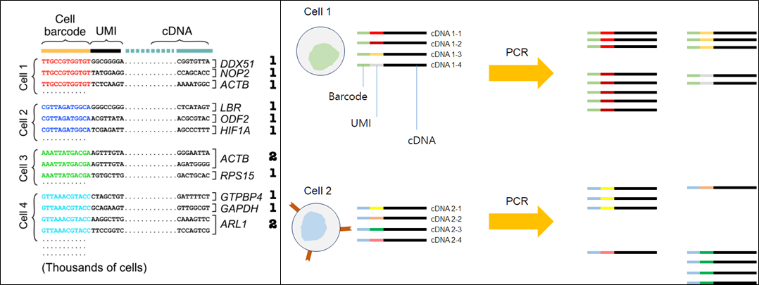 { Cell barcode | UMI (Unique Molecular Identifiers) | cDNA }