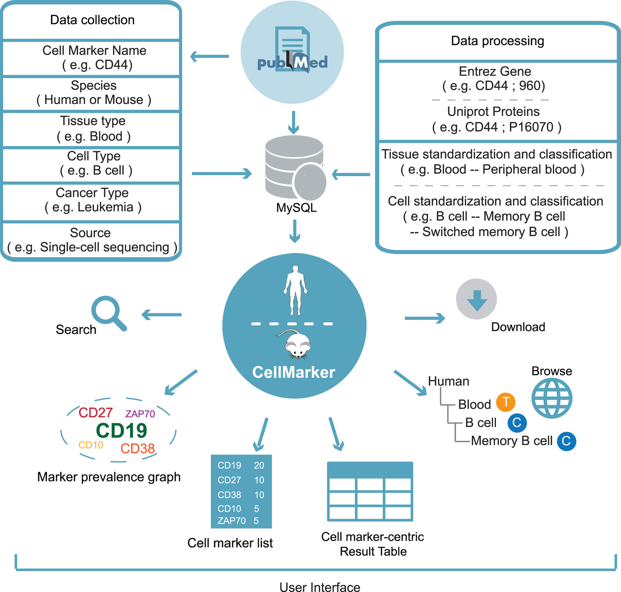 CellMarker database aims to provide a comprehensive and accurate resource of cell markers for various cell types in tissues of human and mouse.