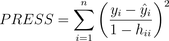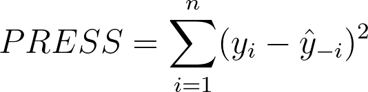 Predicted R-square는 새로운 데이터에 대해서 모델(regression line)이 얼마나 잘 예측하는지 나타내주는 지표이며 overfitting을 판단하는데 활용할 수 있다. 전체 variance에 대한 비교값으로 PRESS(Prediction sum of square)를 사용한다. 이것은 leave-one-out technique으로 관측된 i번째 포인트를 제외하고 regression line을 구한 뒤 xi에 해당하는 예측값(regressionn line의 yhi값)과 yi 값의 차이를 제곱하여 모든 i번째 값에 대해 구해준 값을 더하여 정의한다.