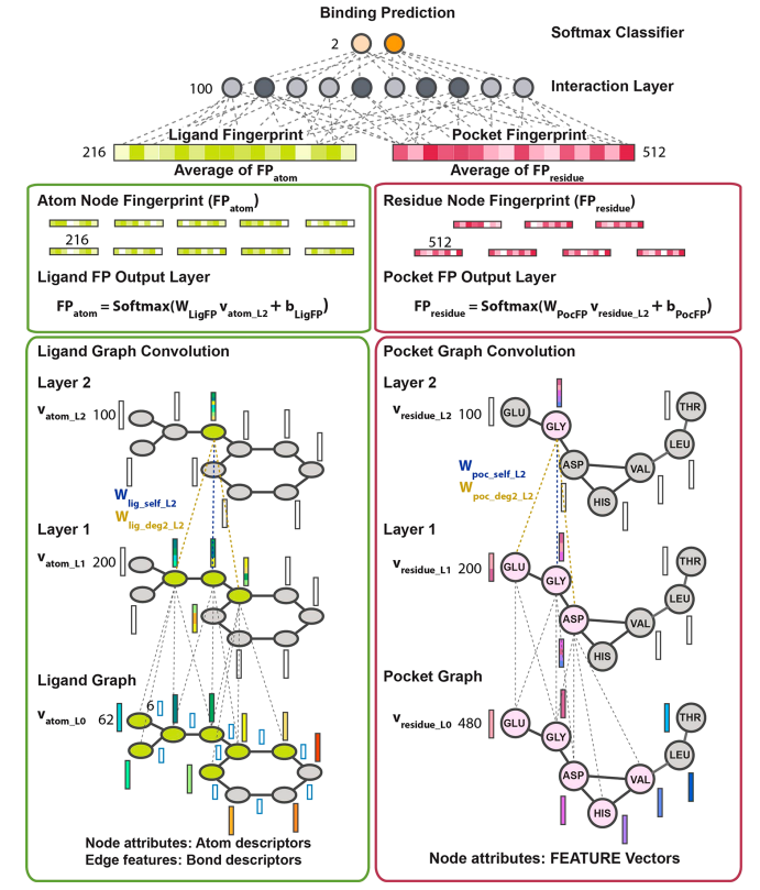 - Interaction layer with 'Protein pocket graph' and 'Small molecule representation' -> Binding classifier