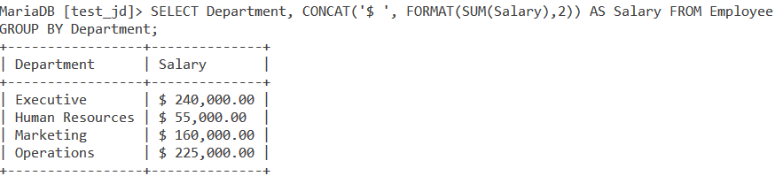 SELECT Department, CONCAT('$ ', FORMAT(SUM(Salary),2)) AS Salary FROM Employee GROUP BY Department;