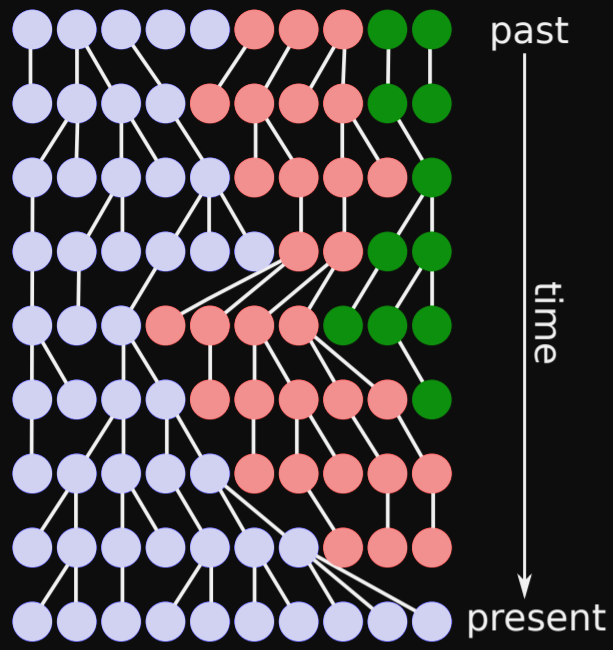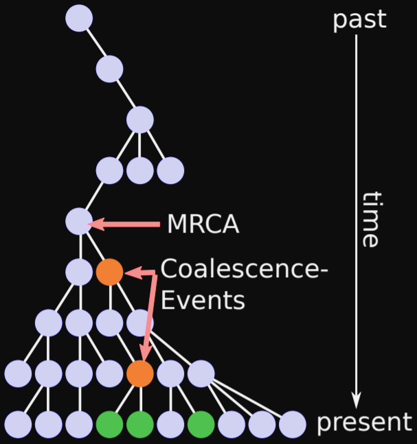 - 물리학에서 Coalescent란 단어 그대로 두 개 또는 그 이상의 물방울 또는 입자가 합쳐져 하나가 되는 과정을 이야기 한다. 아래 그림에서 Colalescence-Event로 표시한 부분이 backward in time에서 하나로 합쳐지는 event가 일어나는 지점이다. 좀 더 자세한 내용은 Coalescent theory를 참고하면 된다.