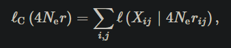 최종 단계에서 전체 시퀀스(4Ner)에 대한 모집단 재결합률의 추정치는 모든 쌍별 비교의 가능성을 결합하여 구한다. 복합 우도는 다음과 같이 주어진다.