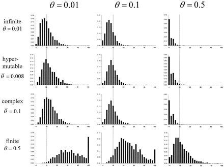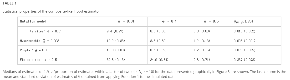 μ'ij는 base i에서 base j까지의 세대별 평균 돌연변이 비율이다(지수 분포에서). 이 모델은 염기 조성 편향이 강한 프로카리오테 게놈의 시퀀스 진화의 복잡성을 반영하기 위해 선택되었다. 유한 사이트: 모든 부위는 동일한 높은 돌연변이 비율(반복 = 0.5)을 가지며 2알레 대칭, 반전성 돌연변이 모델을 준수한다. 이 경우 각 분리 사이트는 표본 이력에서 평균 2.6개의 돌연변이를 경험한다. 이 모델은 인간 면역결핍 바이러스(HIV)와 같은 역발생의 동의어 사이트에서 일어나는 극단적인 수준의 다형성을 나타낸다. 데이터는 null 4Ner = 0 및 4Ner = 10에 따라 시뮬레이션되며, n = 50에 대해, 그리고 선택한 시퀀스 길이로 평균 분리 사이트 수가 40–50 범위에 있다. 이상적으로는 각 시뮬레이션 데이터 세트에 대해 데이터에서 추정된 θ 값에 대한 가능성을 계산해야 한다. 그러나 추정기 속성의 정확한 특성화를 제공하는 데 필요한 반복실험 횟수가 많은 경우, 각 데이터 집합에 대한 가능성을 계산하는 것은 사실상 불가능하다. 대신 we, 0.01, 0.1, 0.5의 서로 다른 세 가지 값에서 우도를 추정하여 각각에 대한 결과를 시뮬레이션 데이터에서 추정된 θ 값의 평균 및 표준 편차와 함께 제시한다. 이 접근방식의 한 가지 장점은 재조합의 검출과 추정에 대한 모델 오타입의 심각성을 특징 지을 수 있다는 것이다.
