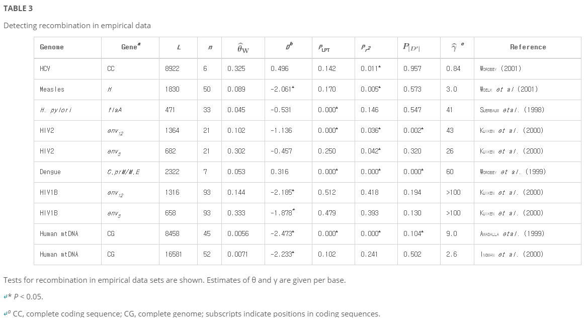 표 3은 분석된 데이터 세트에 대한 타지마 D 통계량의 값을 포함하며, 재조합이 없다고 가정하여 추정된 유의 수준을 나타낸다. 이 통계량은 모든 데이터 집합에 대해 음수인 반면 홍역, HIV1 및 두 mtDNA 데이터 집합에 대해서는 유의하게만 해당된다. 그러나 통계량의 분산은 재조합에 의해 감소된다(그러므로 null 모형에 따른 신뢰 한계 감소). 따라서 다른 데이터 세트(특히 HIV2 데이터)도 표준 중립 모델에서 상당한 편차를 반영할 수 있다. 그러나 표준 중립 모델에서 벗어나는 증거를 보여주는 데이터 집합은 추정 재조합 비율의 완전한 다양성을 반영한다. 요컨대, 가정된 인구통계학적 모델로부터의 이탈이 인구 재결합률 추정에 어느 정도 영향을 미칠 수 있지만, 재결합 신호와 혼동될 가능성은 낮다.