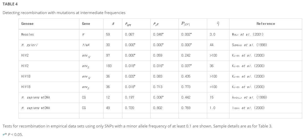 표 3은 유전자 변환 유형 모델에서 이러한 분석의 결과와 모집단 재결합률 γ의 추정치를 보여준다. 식 5를 참조한다. 또한, 동일한 분석을 수행했지만, 경미한 알레르기가 주파수 <0.1>에 있었던 단일 뉴클레오티드 다형성(SNP)을 필터링하여 그 결과를 표 4에 제시하였다. HCV 및 뎅기 바이러스 데이터 세트의 경우, 표본 크기가 <10>이므로 여과된 분석의 결과는 표 2의 결과와 동일하다. Meunier와 Eyre-Walker(2001)는 |D ||와 거의 동일한 방식으로 동작하기 때문에 테스트 결과도 생략했다.