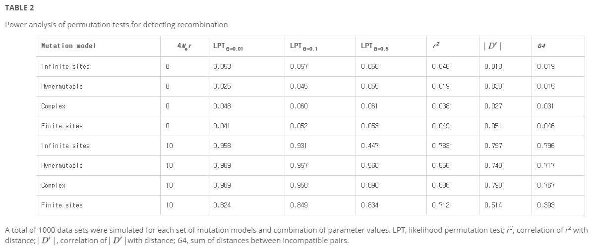 중요한 결과는 우도 순열 테스트가 일관되게 모집단 유전자 데이터에서 재조합을 검출하는 가장 강력한 순열 기반 방법이라는 것이다. 무한대 데이터의 경우 거의 96%의 사례에서 재조합이 검출되며, 다른 테스트의 경우 최대 80%가 검출된다. 우도를 추정하는 데 사용되는 모형이 실제 모형과 매우 다른 경우에도 검정의 검정력은 상당하다. 예를 들어 유한점 모형에 의해 생성된 데이터를 with = 0.5로 하여 θ의 정확한 값을 사용하여 우도를 계산하는 경우의 83%에서 재조합이 검출되는 반면, = = 0.01을 사용하여 우도를 추정하는 경우는 82%이다. 이와는 대조적으로 4개의 게이메트가 모두 존재하는 쌍의 분포에 크게 의존하는 방법(|Dd|, G4)은 이처럼 높은 수준의 돌연변이(각각 51%, 39%) 하에서 전력을 크게 감소시켰다. 우도 순열 시험이 검정력을 감소시킨 한 가지 상황은 value의 참 값이 우도를 추정하는 데 사용된 값보다 훨씬 낮은 경우지만, 경험적 데이터에 대해서는 그러한 상황이 발생하지 않을 것이다. 또한 생물학적으로 그럴듯한 시퀀스 진화의 모델에 대해서는 r2와 물리적 거리 사이의 상관관계를 이용하여 재조합을 검출하는 힘이 |D′| 또는 G4보다 일관되게 크다는 점도 주목할 필요가 있다.