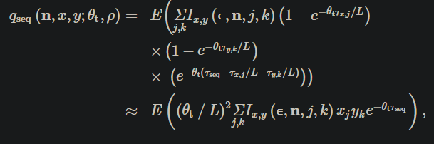 여기서 근사치는 선택된 지수 항을 확장하고 질서의 조건(tt/L)3 이상에 의해 얻으며, 여기서 ix,y는 이전과 같이 지표 함수지만, 이 경우 사이트 x와 사이트 y의 유전자 계보에 따라 달라진다. ix,y는 사이트 x 트리의 j번째 분기와 사이트 y 트리의 k번째 분기가 주어진 a-d 지정 샘플 구성 n으로 이어질 경우 하나이다. 시퀀싱된 표본의 확률에 대한 이 식은 마지막 항인 e-valttseq를 제외하고 기본적으로 2-로쿠스 구성(2)에 대한 식과 동일하다. hseq(n, x, y; ρt)를 나타내는 시퀀스 데이터의 h(n; ρ)의 아날로그는