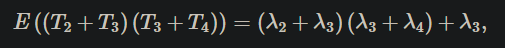 이는 aj와 bk가 기하급수적으로 분포하는 하나 이상의 연속된 T-시퀀스 원소의 합이기 때문에 실현 가능하다. aj와 bk가 T-시퀀스 요소를 공통으로 공유하지 않는다면, 제품에 대한 기대는 기대의 산물이다. 만약 그들이 공통적인 요소를 가지고 있다면, 제품에 대한 기대는 기대의 산물 + 두 가지 모두에 공통적인 요소들의 기대의 합이다. 예를 들어, aj가 T2 + T3의 합과 같고 bk가 T3 + T4인 경우, 상수 모집단 크기 모형에서 ajbk에 대한 기대치는 다음과 같다.