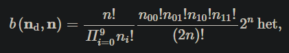 이제 이중 이형체 단계가 실험자에 의해 결정되지 않는 경우를 생각해 보자. 이 경우, n0이나 n1은 관측할 수 없지만, 그 합계는 관측한다. 우리는 그 금액을 ndh로 표시한다. 이 경우 diploid 데이터 세트를 nd-9 = (ndh, n2, …, n9)로 나타낸다. ndh를 고려할 때, 실제 연결 단계 이중 이형체 수 n0은 0에서 ndh까지의 값이 될 수 있다. 이러한 가능한 각 값은 다른 nd 구성에 해당한다. 우리는 이러한 가능한 nd 구성을 nd(i, nd-9)로 나타낸다. 여기서 i = 0, …, ndh. 즉, nd-9 = (ndh, n2, … , n9)이면 nd(i, nd-9) = (i, ndh - i, n2, …, n9). 그런 다음 이러한 상호 배타적 가능한 nd 구성 각각에 대한 확률을 다음과 같이 합산하여 dploid 구성 nd-9의 확률을 구한다.
