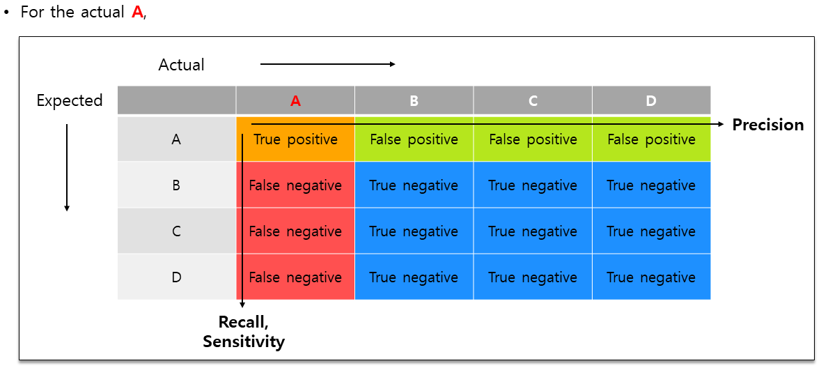 A에 대해서 precision과 recall은 2x2 계산과 같고, accuracy는 전체에 대해 True값들을 계산하면 된다. 판단이 어려울 수 있는 부분은 true negative인데, A를 기준으로 보고 있고, 실재 A가 아닌 것들에 대해서 아닌 것으로 예측했니 true negative가 되는 것이다.