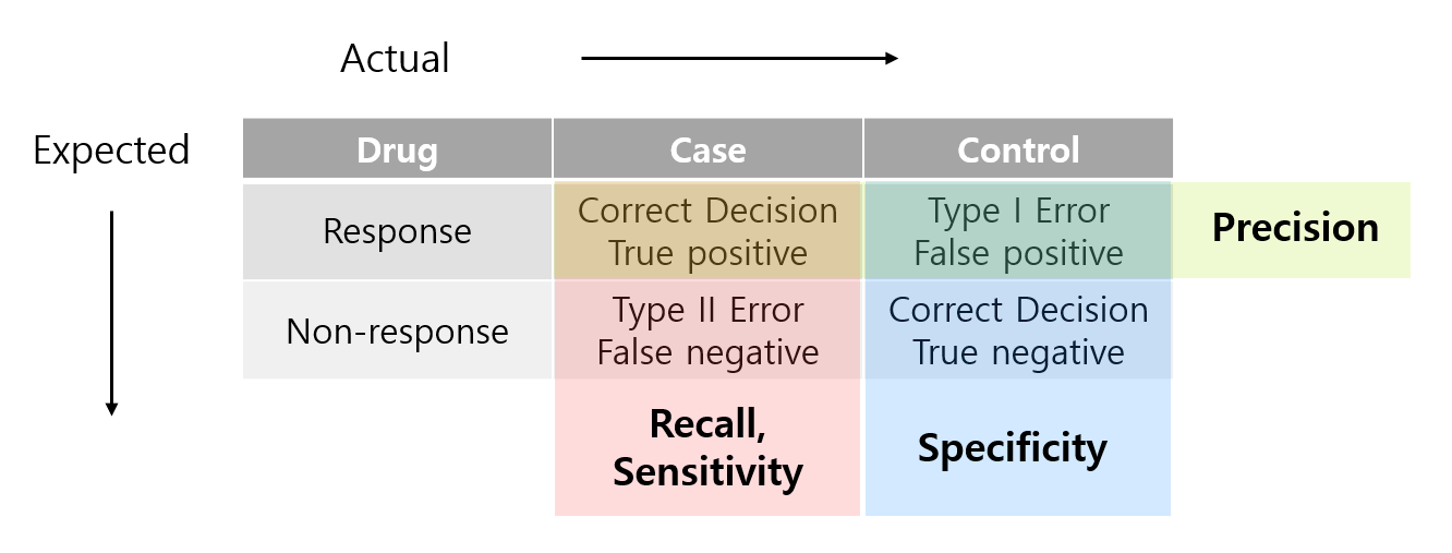- Specificity : Recall과 반대로 control을 얼마나 잘 예측했는가 하는 것이다. 특이도라고 한다.