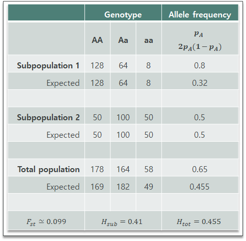 각각의 subpopulation은 HWE를 따르고 있다. 하지만 total population에서 보면 heterozygote가 expected 보다 적다. 이는 두 집단이 다름을 이야기한다. Fst는 그 정도를 나타내는 값이다.