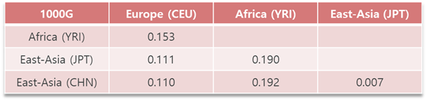 1000 Genome data에서 대륙별 Fst는 다음과 같다.